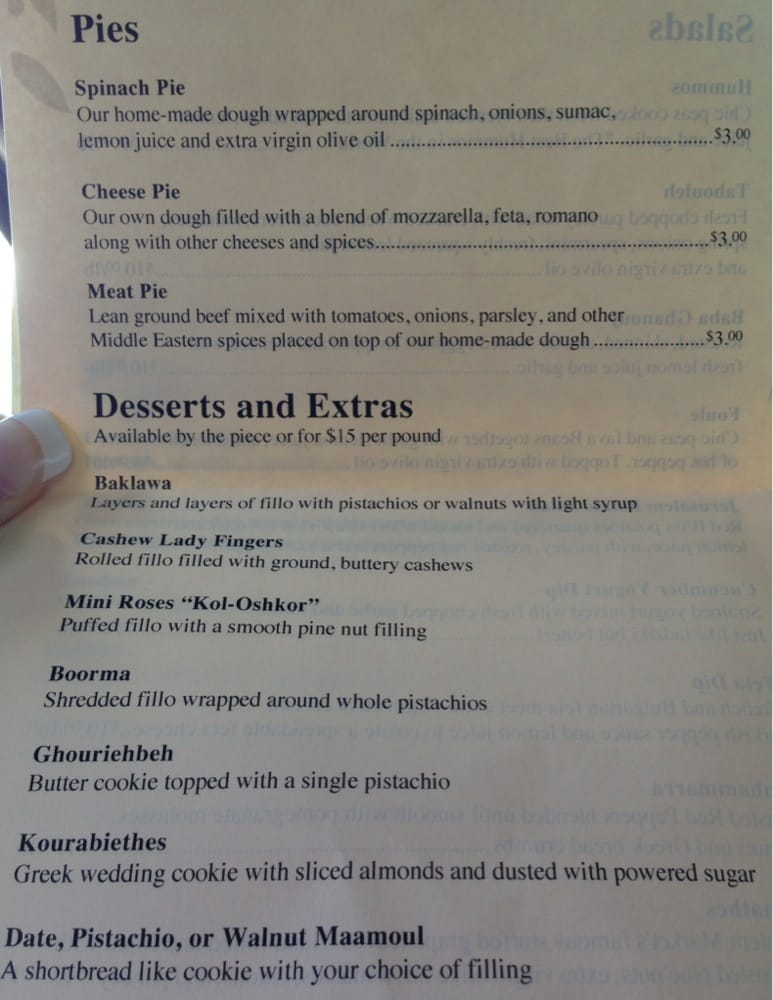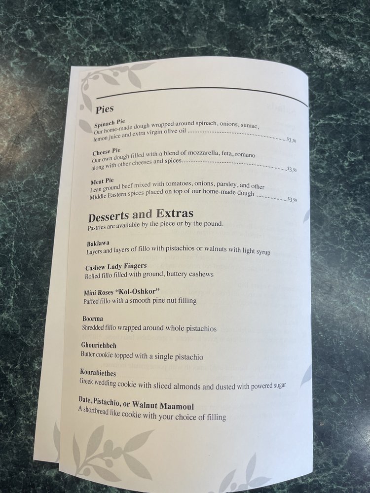 Don't miss their Middle Eastern pies, especially the Spinach Pie, a delight wrapped in olive oil-infused dough, or the rich Cheese Pie, perfectly blended with mozzarella and feta.