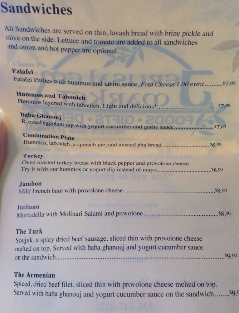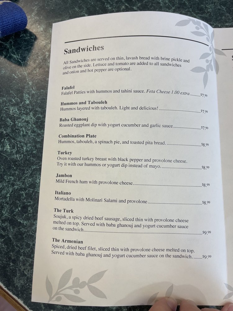 Start with the Combination Plate Sandwich, a flavorful mix of hummus, tabouleh, a spinach pie, and toasted pita bread for just $8.99. For those craving spice, the Turk Sandwich packs a punch with sujuk, roasted beef sausage topped with melted provolone, served alongside baba ghanouj and yogurt cucumber sauce.